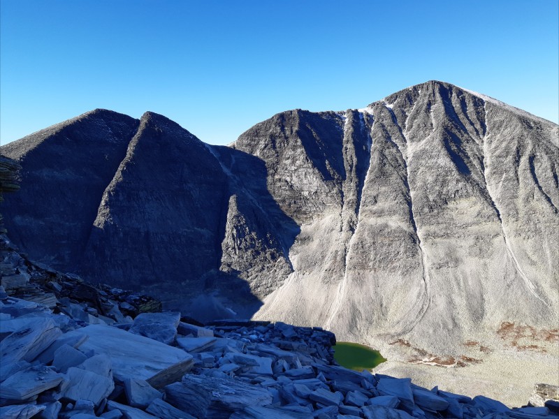 We were hiking with a full backpack, because we were going to camp in a small tent for a single night in the mountains. It turned out that Storronden couldn't really be climbed from the north east by normal hikers like us, so we had to turn around and head back down the endless boulder field. Here is a view of Vinjeronden and Rondslottet from a small pass at about 1860 m elevation on the way down: