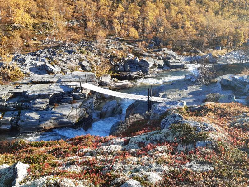 As you can see, the weather was great. The first goal was to set up camp a few km away from the parking lot. We had to cross the river using the hanging bridge you can see in the distance here: