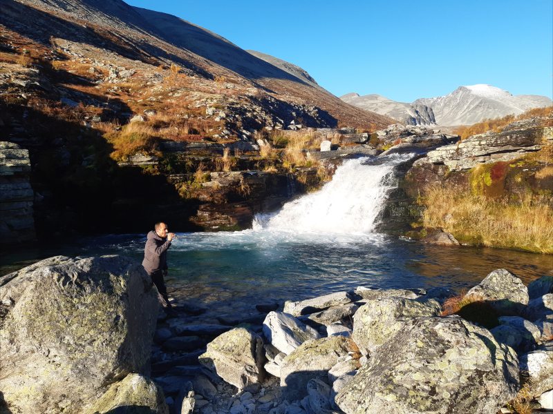 The second full day started with a hike up the same valley, but this time we focused on the mountains south of the valley. We had to cross a large river. Here, Ulrik is filling water bottles and tasting the water to make sure it is good: