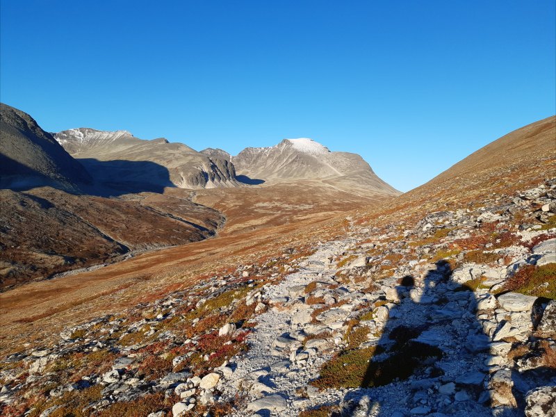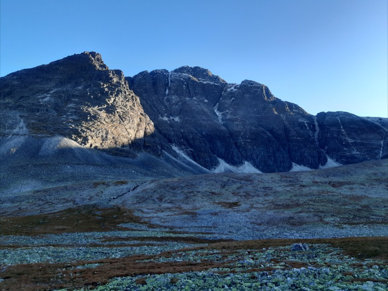 The mountains you can see in this picture are south of the valley with Rondslottet having the most snow. The peaks of this first day are on the north side of the valley, so behind the hill on the right.