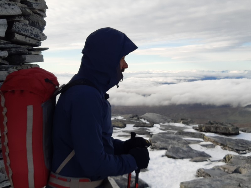 You can see that the two peaks of Midtronden are almost level with the horizon, so the picture is from about 2050 m altitude on the way to the peak of Rondslottet. The wind was strong and we knew it was going to get worse once we reached the peak, so we took a break in a small sheltered cave: