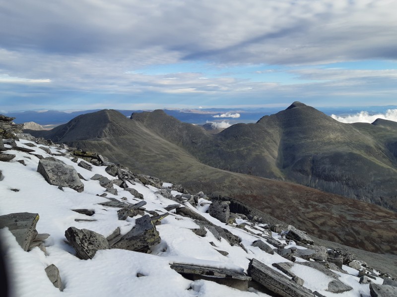 We made it over the peak and headed towards the pass between Rondslottet and Vinjeronden. Here is a look back at Rondslottet: