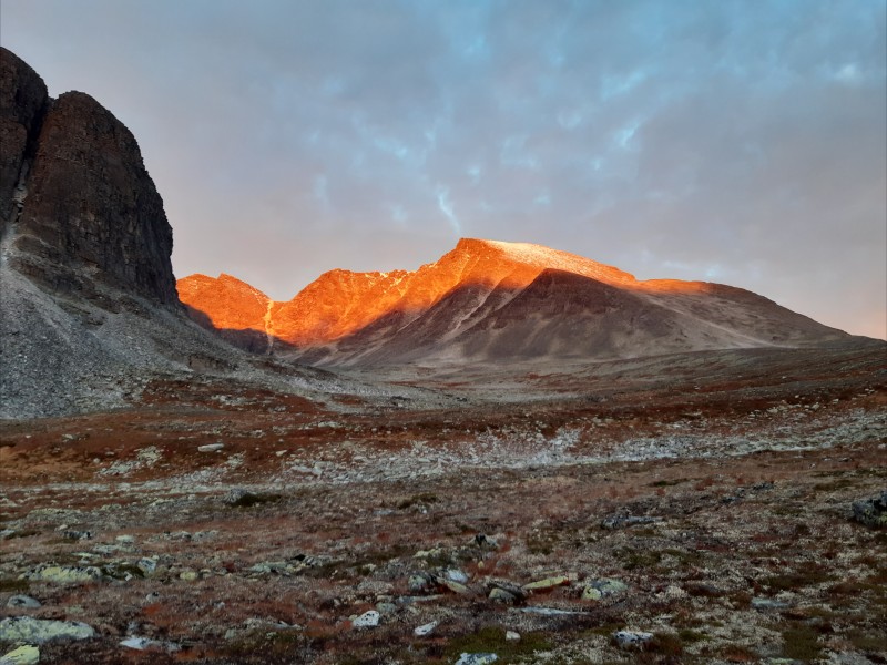 The sun rising on Rondslottet which is the highest peak in the park at 2178 m of elevation: