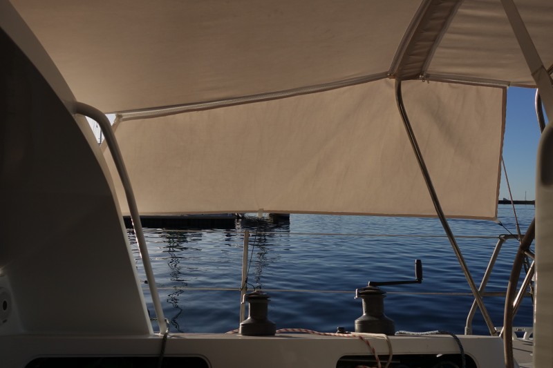 The new mainsail cover completed the transition from green fabric on the edges of the sails as well as on the bimini and mainsail cover to a lighter color that tends to stay cooler under the glare of the sun. Here is the new bimini with new sides seen from the inside: