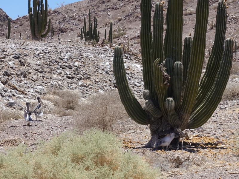 We had to cut the hike short and retreat to the beach to avoid upsetting all the birds but were able to get a picture of a few young pelican hiding in the shade of a cactus.
