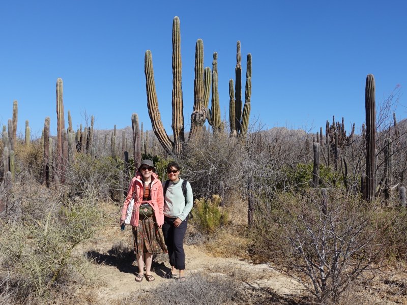 Maria and Félicie in front of large cacti. Is was a very windy and cool day so we were wearing some layers: