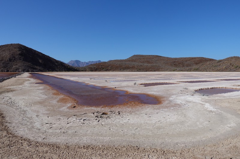 The salt pits are still full of water. Pinkish-brown salt tolerant algae grow in the salt water: