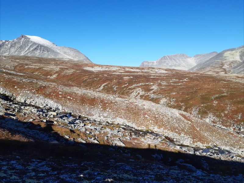 The mountains you can see in this picture are south of the valley with Rondslottet having the most snow. The peaks of this first day are on the north side of the valley, so behind the hill on the right.