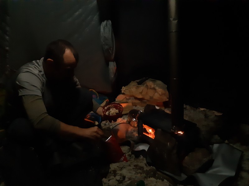 The first night was cold with frost on the tent in the morning, but even as the oven died out in the evening we were comfortable in our winter sleeping bags.