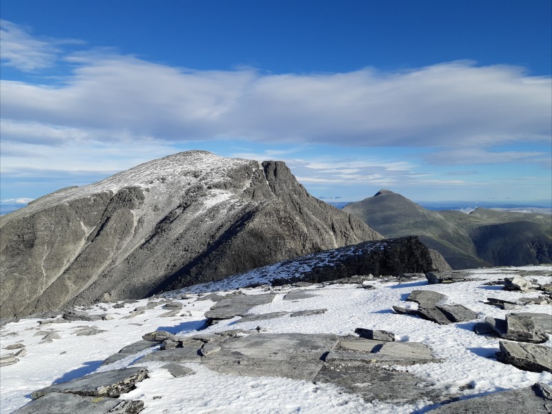 We made it over the peak and headed towards the pass between Rondslottet and Vinjeronden. Here is a look back at Rondslottet:
