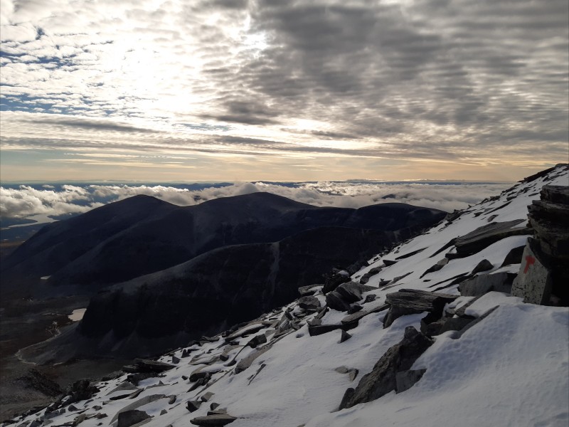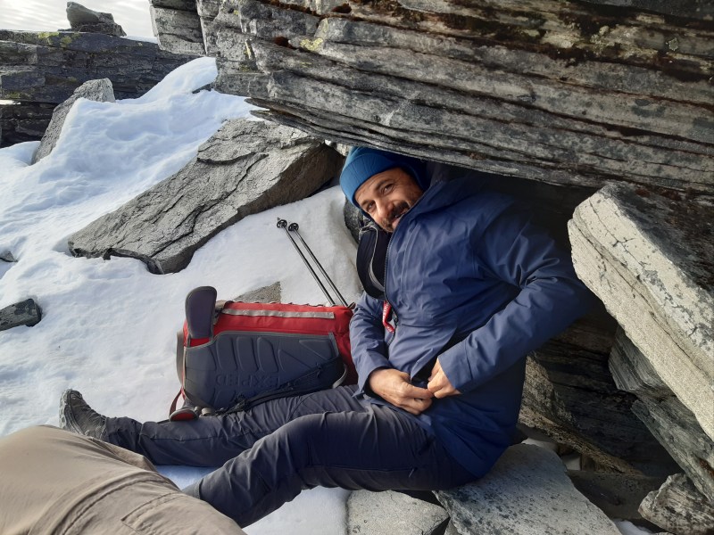 You can see that the two peaks of Midtronden are almost level with the horizon, so the picture is from about 2050 m altitude on the way to the peak of Rondslottet. The wind was strong and we knew it was going to get worse once we reached the peak, so we took a break in a small sheltered cave: