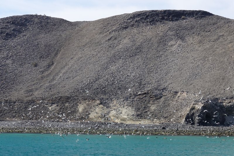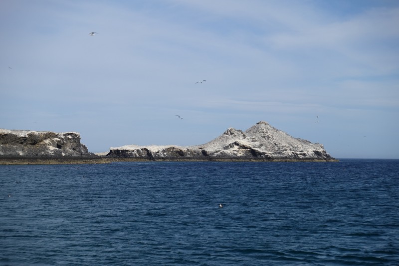 When we turned around and looked back into the bay where we had anchored, we could see the bird-poop covered cliffs next to the entrance of the bay: