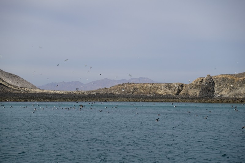 The constant hum from the bird colony continued all night. The next day we decided to leave the birds in peace and go back towards the Baja coast. We left in the morning as the fog rolled over Isla Partida: