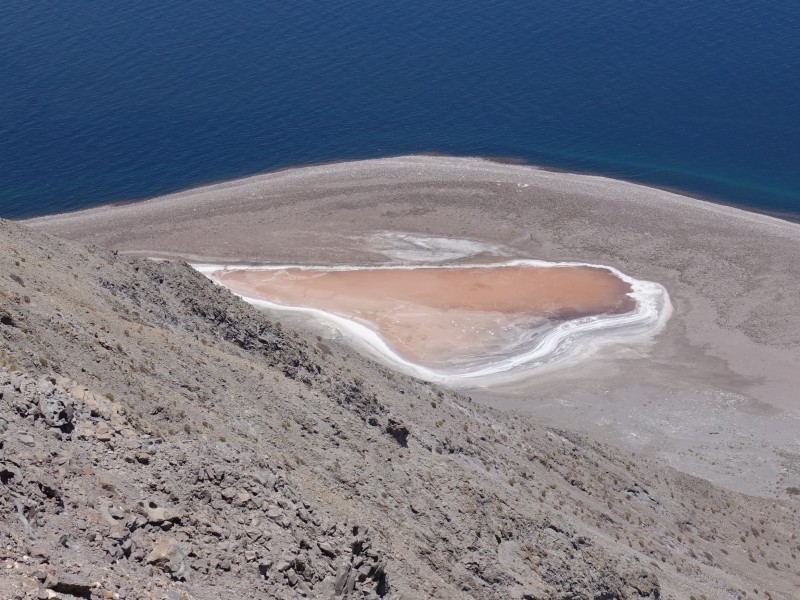 An algae-pink salt pond on the opposite side of the peak: