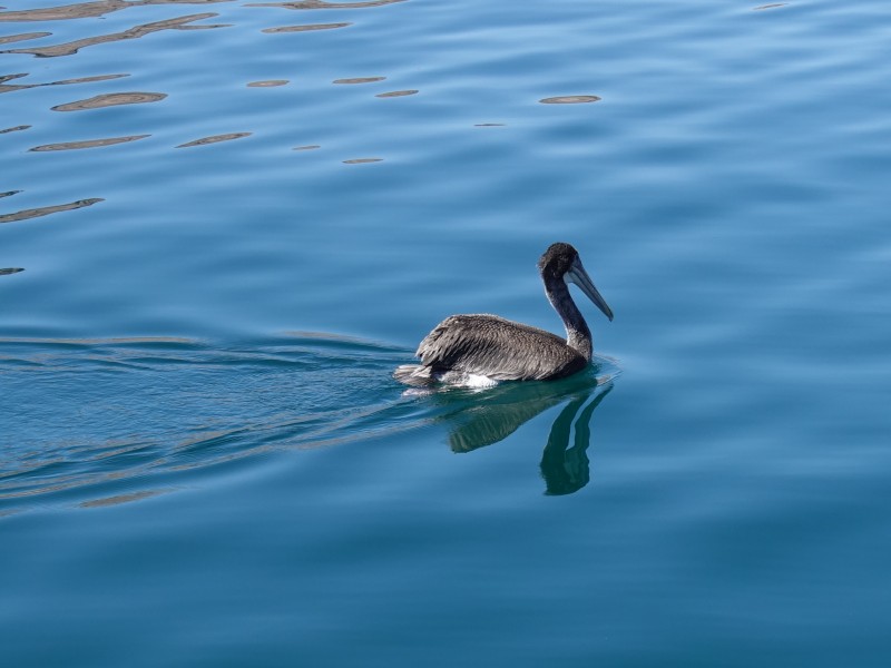 We found a nice anchorage on the north coast of Isla Angel de la Guardia. The island is not inhabited but has huge colonies of birds. Here's a curious pelican swimming by the boat: